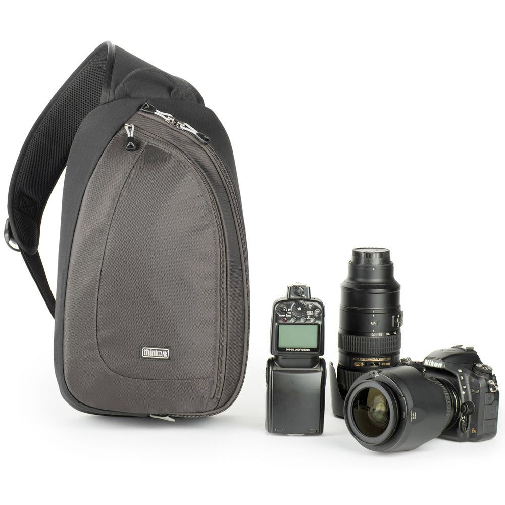 Lightweight sling bag for DSLR system, tablet, chargers, memory cards, and more.