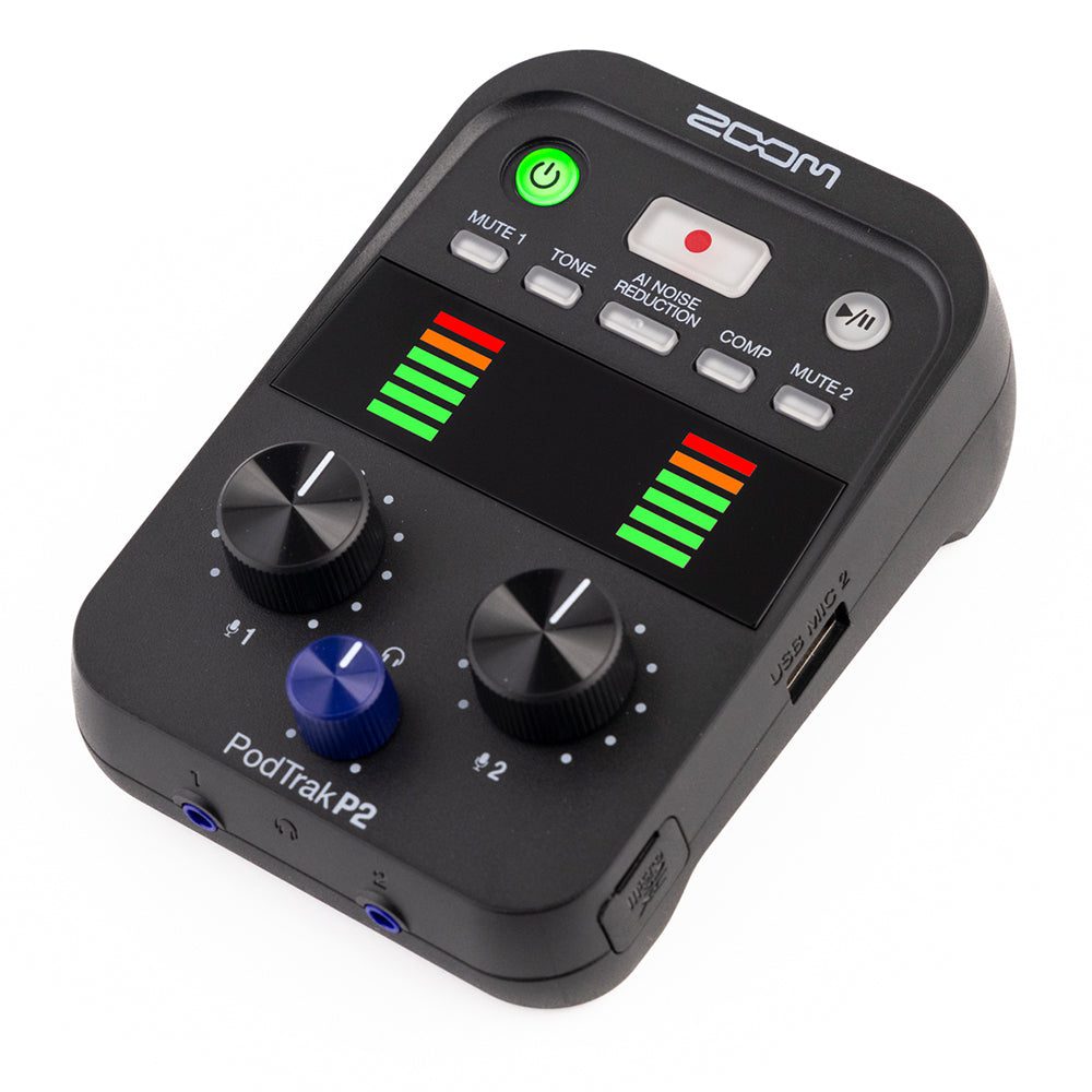 The Zoom PodTrak P2 is the perfect companion for podcasting on the move. The portable design is loaded with the features you need for your production, including 2 mic channels, call-in support, AI noise reduction, output to a mobile phone, and more.